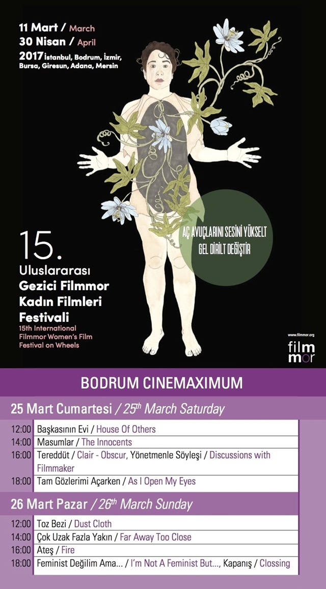 15. Uluslararası Gezici Filmmor Kadın Filmleri Festivali Bodrum Kadın Dayanışma Derneği ortaklığıyla 25-26 Mart'ta Bodrum'da, Midtown Cinemaximum'da sürüyor.