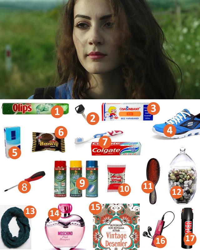 1- Naneli şeker. Stresli zamanlarında kalpten gitmemek için. 2- Savaş'ın motosikletinin anahtarları. Ansızın çekip gidemesin diye yanında taşıyor. 3- Yara bandı. Kalbinin kırıklarını böyle onarmayı planlıyor. 4- Spor ayakkabıları. Lazım geldiğinde şık bir ortamdan rahatça tüyecek. 5- Kağıt mendil. Dilinin ucuna gelenleri söyleyemediğinde istek parça yapacak. 6- Browni kek. Panik yaptığında karnından gelen guruldamalara son verecek. 7- Diş fırçası. Süslü değil diye bakımsız mı sanmıştınız? 8- Yıldız tornavida. Tamirat işinin ne zaman çıkacağı belli olmaz. 9- Sprey boyaları. Boş bir duvar bulduğu an rengarenk şekiller çizecek. 10- Çekirdek paketi. Gerginliğe karşı birebir. 11- Saç fırçası: O artık aşık bir genç kız. Bu demektir ki çantaya önce saç fırçası sonra sırayla tam takım makyaj malzemeleri girer. 12- Çakıl taşı dolu kavanoz. Doldurmuş içine İzmir sahillerinin taşlarını, ıssız yerde yaklaşan olursa çantayı kafasına indiriyor. 13- Kaşkolu. Soğuk havalarda burnu üşüyüp kızarmasın diye takacak. 14- Parfümü. 15- Yetişkinler için olan boyama kitabı. Boş duvar bulamadığında iyi iş görüyor. 16- Mp3 çaları. Şarkılarla başbaşa kalmayı ikizi gibi o da çok seviyor. 17- Biber gazı. Canını sıkan olursa şak diye kullanacak.